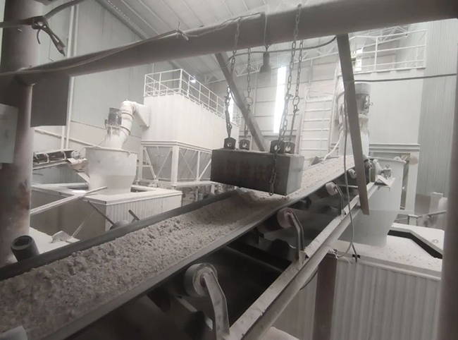 随后矿石将被输送入一级鄂式破碎机破碎至150毫米以下,同时均匀落在底部皮带输送机上。现场工作人员负责检查筛选出皮带上的低品位矿石,以有效提高矿石的白度与品位。经过挑选后再次进入二级锤式破碎机,进一步细碎。